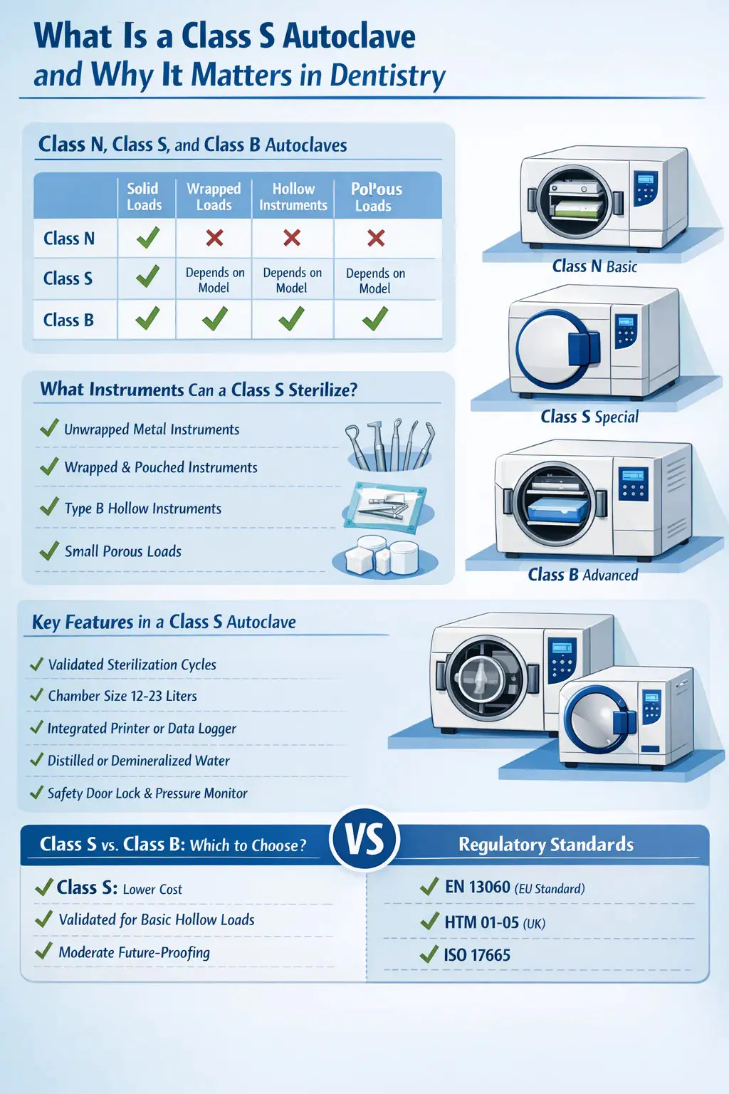 একটি ক্লাস এস অটোক্লেভ হল একটি বাষ্প নির্বীজনকারী যা একটি নির্দিষ্ট, প্রস্তুতকারক-নির্ধারিত পরিসরের লোডগুলি পরিচালনা করার জন্য ডিজাইন করা হয়েছে — নির্বীজন কার্যক্ষমতার পরিপ্রেক্ষিতে মৌলিক ক্লাস N এবং সম্পূর্ণরূপে সক্ষম ক্লাস B-এর মধ্যে বসে। দাঁতের অনুশীলনে, ক্লাস এস অটোক্লেভ হল সবচেয়ে বেশি ব্যবহৃত নির্বীজন ইউনিটগুলির মধ্যে একটি , কারণ এটি খরচ, চক্রের গতি এবং যেকোন ডেন্টাল ক্লিনিকে মানসম্মত ফাঁপা এবং ছিদ্রযুক্ত যন্ত্রগুলি প্রক্রিয়া করার ক্ষমতার মধ্যে একটি ব্যবহারিক ভারসাম্য অফার করে।