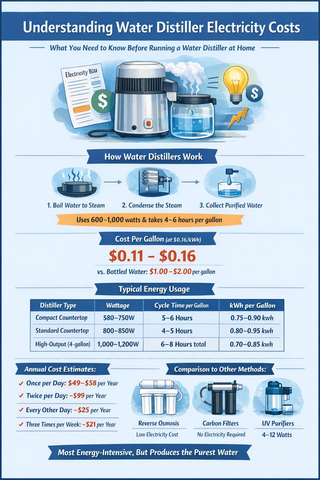 | ডিস্টিলার প্রকার | ওয়াটেজ | সাইকেল সময় (প্রতি গ্যালন) | গ্যালন প্রতি kWh | দৈনিক খরচ ($0.16/kWh এ) |