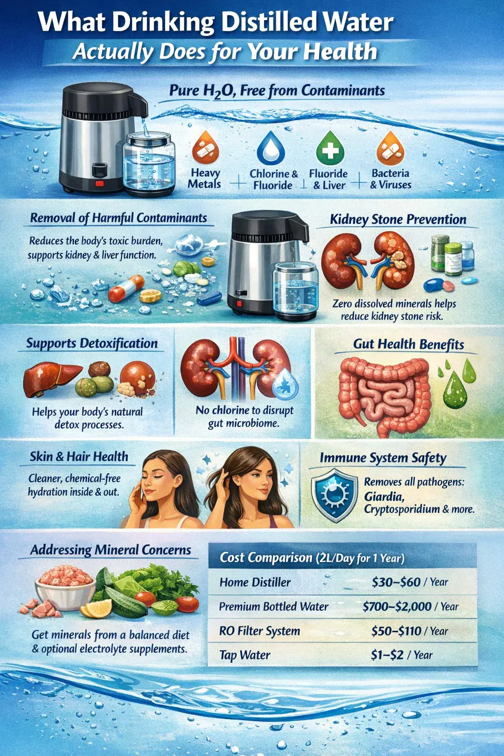 সাধারণ সুস্থ প্রাপ্তবয়স্কদের জন্য, সুবিধাটি আরও দীর্ঘমেয়াদী এবং প্রকৃতিতে প্রতিরোধমূলক: শরীরের মোট বিষাক্ত বোঝা হ্রাস করা, কিডনি এবং লিভারকে তাদের প্রাকৃতিক কার্যে সহায়তা করা এবং নিশ্চিত করা যে সবচেয়ে মৌলিক পুষ্টির ইনপুট — জল — যতটা সম্ভব পরিষ্কার। খনিজ-সমৃদ্ধ খাদ্যের সাথে যুক্ত, পাতিত জল হল একটি ব্যবহারিক, সাশ্রয়ী মূল্যের এবং বৈজ্ঞানিকভাবে সঠিক পছন্দ যে কেউ তাদের স্বাস্থ্যকে গুরুত্ব সহকারে নেয়৷