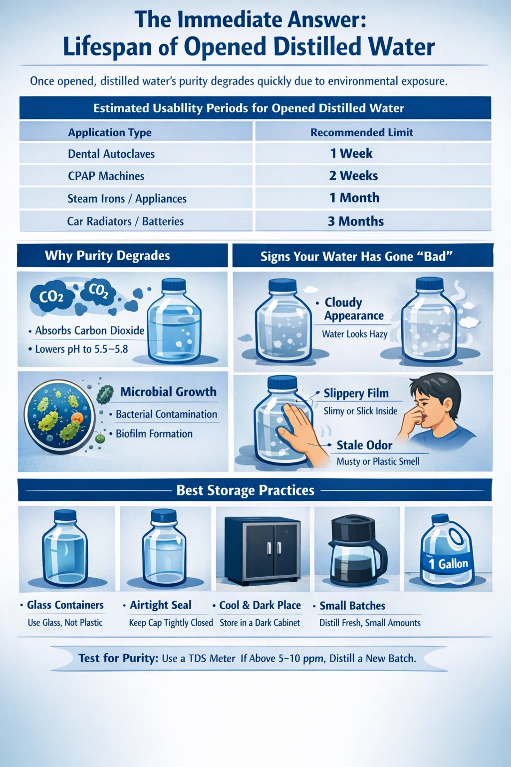 খোলা পাতিত জলের "শেল্ফ লাইফ" আপনি এটি দিয়ে কী করতে চান তার উপর নির্ভর করে। একটি গাড়ির ব্যাটারির জন্য বিশুদ্ধতার প্রয়োজনীয়তা একটি ডেন্টাল সার্জিক্যাল সেন্টারের থেকে সম্পূর্ণ আলাদা।
