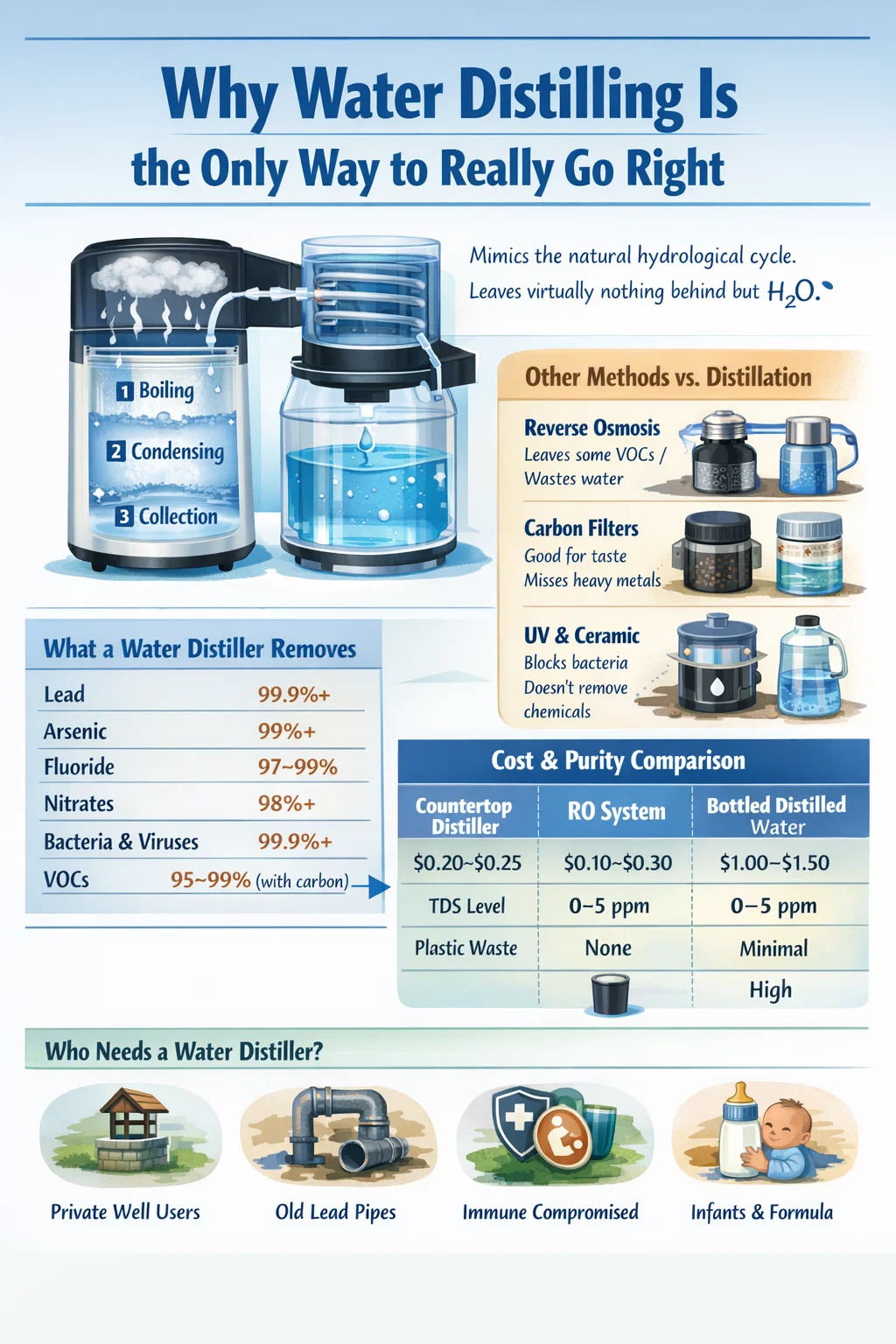মূল নীতিটি সহজ: জল ফুটতে উত্তপ্ত হয়, বাষ্প উঠে যায় এবং একটি কুলিং কয়েলের মধ্য দিয়ে ভ্রমণ করে এবং এটি একটি পরিষ্কার সংগ্রহের পাত্রে তরল জলে ফিরে আসে। বাষ্পের সাথে বাষ্পীভূত হতে পারে না এমন কিছু পিছনে থাকে। তার মানে ভারী ধাতু, দ্রবীভূত লবণ, ব্যাকটেরিয়া, ভাইরাস, সিস্ট, নাইট্রেট, ফ্লোরাইড, ক্লোরিন উপজাত এবং বেশিরভাগ উদ্বায়ী জৈব যৌগ অবশিষ্টাংশ হিসাবে ফুটন্ত চেম্বারে ফেলে রাখা হয়। আপনি যা সংগ্রহ করেন তা বিশুদ্ধ জলের কাছাকাছি যতটা আপনি বাড়িতে বা একটি ছোট বাণিজ্যিক পরিবেশে উত্পাদন করতে পারেন।