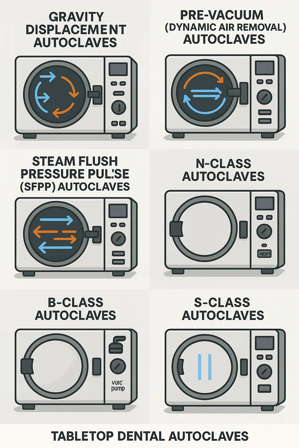 | স্টিম-ফ্লাশ প্রেসার পালস | বাষ্প ডাল চেম্বার থেকে বায়ু জোর করে | ছিদ্রযুক্ত লোড, শক্তভাবে প্যাক করা যন্ত্র | মাঝারি আয়তনের ক্লিনিকের বহুমুখিতা প্রয়োজন |