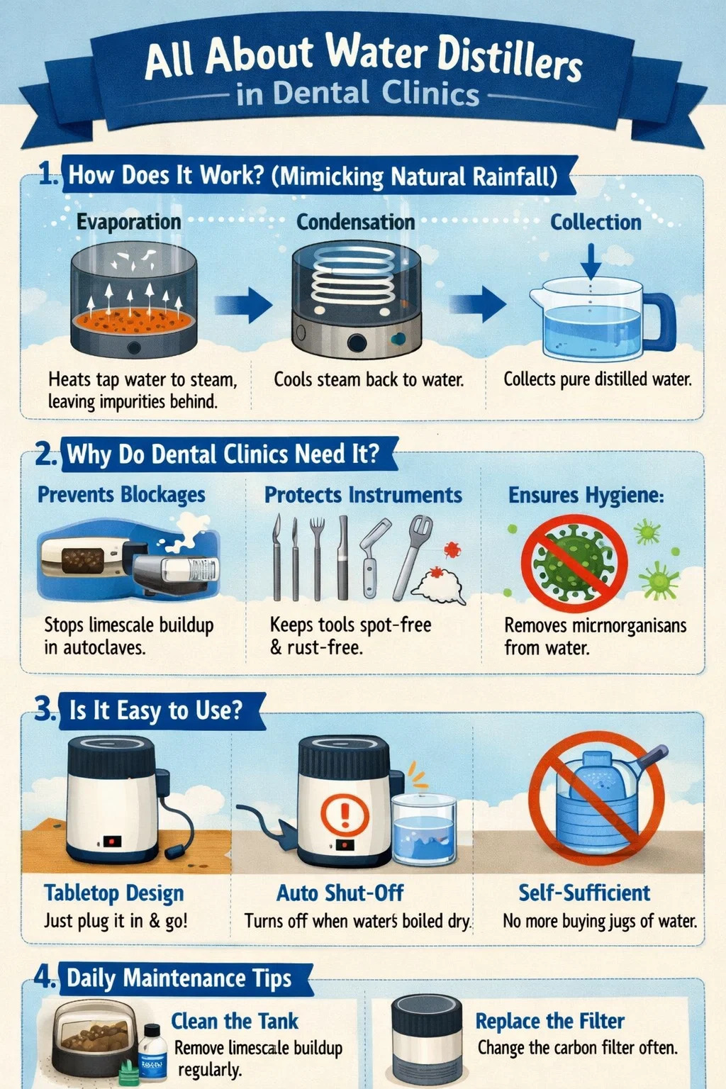 ক জল পাতনকারী মূলত "বিশুদ্ধ জল" উৎপাদনের জন্য নিবেদিত একটি ছোট কারখানা। ডেন্টাল ক্লিনিকগুলিতে, এটি সাধারণত ডেন্টাল অটোক্লেভগুলির জন্য সর্বোত্তম অংশীদার, কারণ অটোক্লেভগুলি তাদের ব্যবহার করা জল সম্পর্কে খুব "পিকি" এবং শুধুমাত্র এই পরিষ্কার পাতিত জল ব্যবহার করতে পারে।