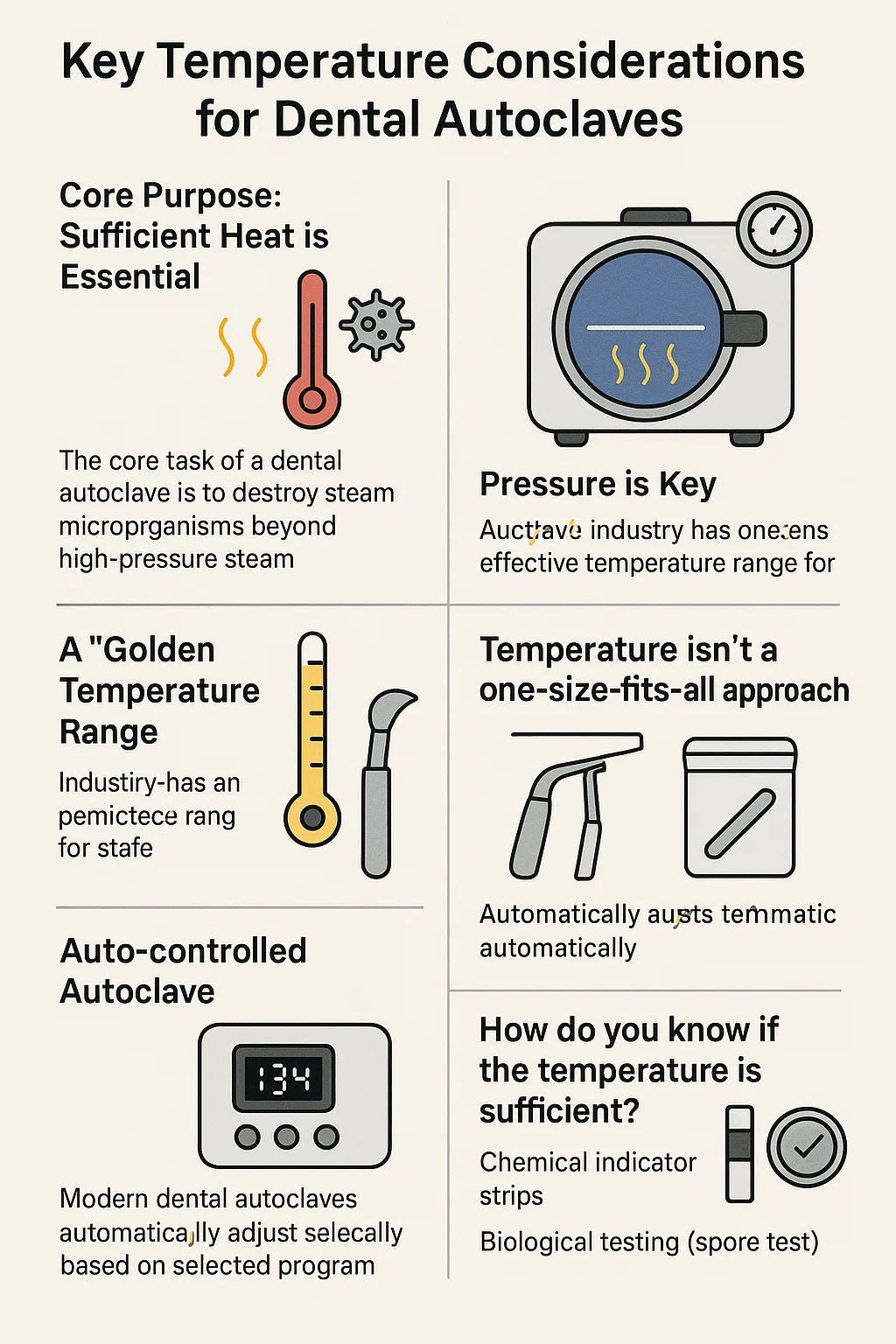 দীর্ঘমেয়াদী অনুশীলনের মাধ্যমে, ডেন্টাল শিল্প নির্বীজন করার জন্য সর্বজনীনভাবে স্বীকৃত এবং কার্যকর তাপমাত্রা পরিসীমা চিহ্নিত করেছে।